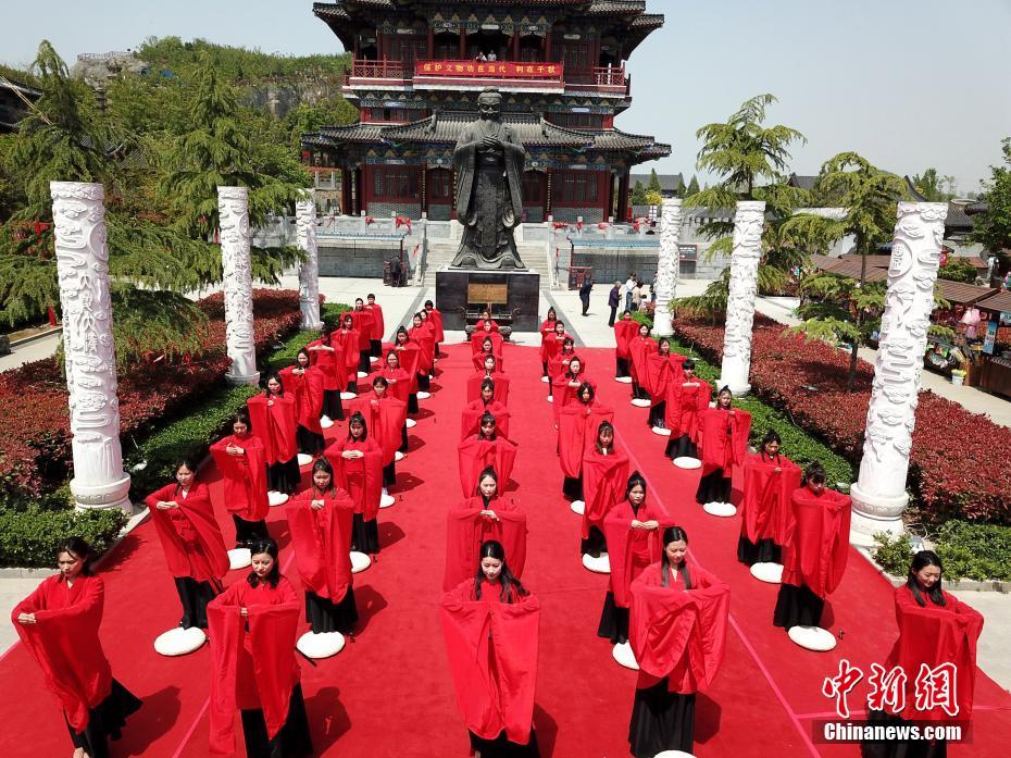 4月17日,河南永城芒碭山旅游區(qū)夫子山孔子像前,數(shù)十名女子身著漢服重新按照中國古禮參加女子成人大典,隨著現(xiàn)場古韻悠長的禮樂響起,姑娘們經(jīng)過及笄禮、簪拜之禮等議程完成自己的成人禮,致敬傳統(tǒng)文化禮儀。中新社記者王中舉攝