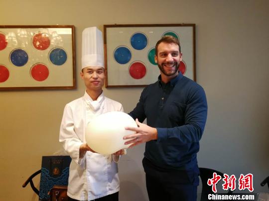 現(xiàn)場(chǎng)吹制過程中,他與劉輝把面團(tuán)放在一張桌面留空的桌子上,然后把一根細(xì)膠管從桌子下面通過桌孔插入面團(tuán)中,二人開始輪流吹氣。20分鐘后,他們吹出了直徑1.8米的面氣球。