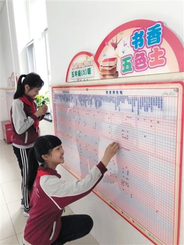 “紅色代表‘這本書讓我感動’,藍(lán)色代表‘書中的語言吸引我’,青色代表‘我喜歡這本書的設(shè)計風(fēng)格’……”在北京大學(xué)附屬小學(xué)石景山學(xué)校每個班的門外,都有一塊五顏六色的班級閱讀評價板,學(xué)生在讀完每本書后,可以用六種顏色的貼紙代表不同的閱讀感受。