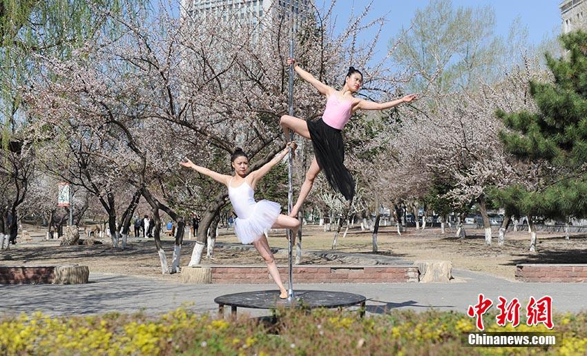 幾名舞者在杏花的映襯下跳起了鋼管舞。劉棟攝