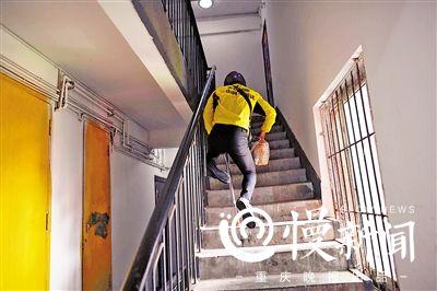 老小區(qū)里沒有電梯,買家住七樓,陳超手提外賣,拄拐奮力爬樓。