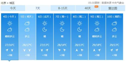 北京市氣象臺預(yù)計(jì),今天白天晴間多云,北轉(zhuǎn)南風(fēng)二三間四級,最高氣溫27℃;夜間晴轉(zhuǎn)多云,南轉(zhuǎn)北風(fēng)二級左右,最低氣溫16℃。