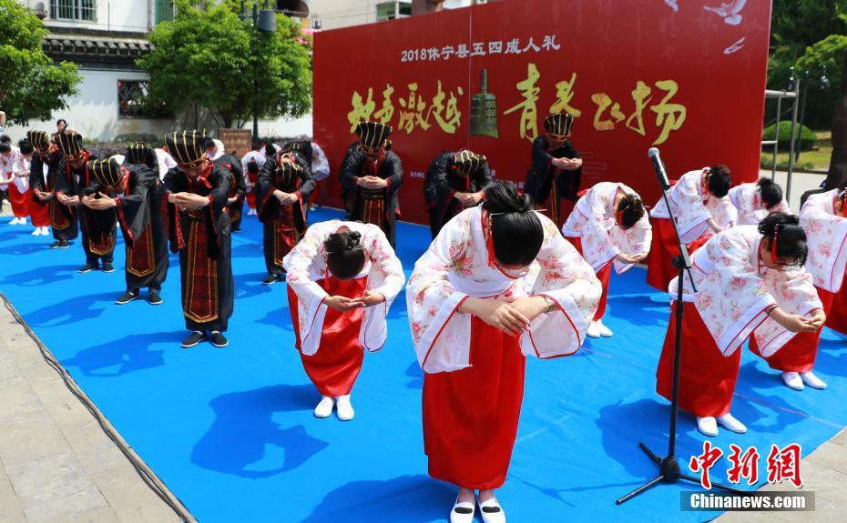 當(dāng)日,休寧縣中學(xué)生代表身著大氣優(yōu)雅的朱子深衣和襖裙,通過“加笄加冠”、“禮拜師長”、“誦讀《朱子家訓(xùn)》”等儀式,親身感受古華夏傳統(tǒng)禮儀,宣告成年。圖為受禮者禮拜天地。 (文字張婭子/圖陳佳)