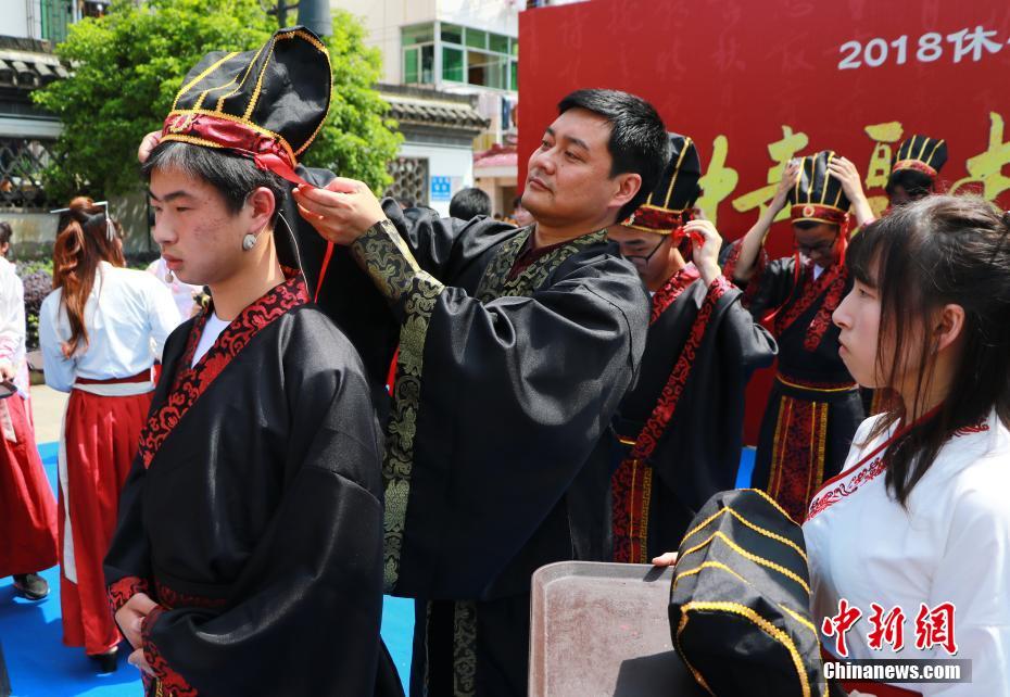 當?shù)赝ㄟ^舉辦漢式集體成人禮,旨在迎接第69個五四青年節(jié),傳承弘揚“感恩父母、尊師重孝”的中華民族優(yōu)秀傳統(tǒng)文化,讓廣大即將成年的青年學子修身立德,做一個德才兼?zhèn)鋵ι鐣胸暙I、有價值的人。圖為正賓為受禮者加冠。 (文字張婭子/圖陳佳)