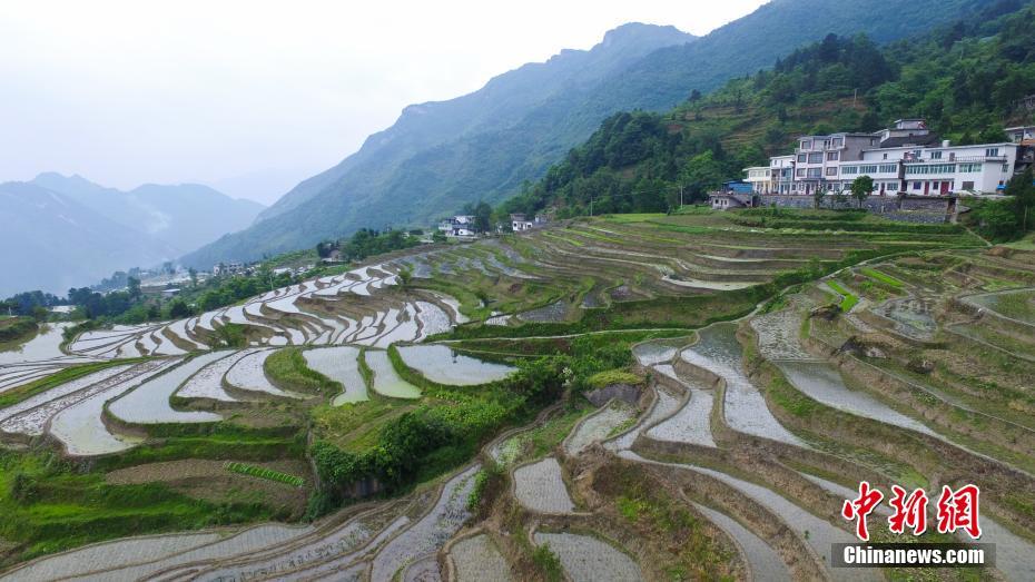 5月9日,堯龍山梯田高低錯(cuò)落,周圍有房屋和樹木點(diǎn)綴。堯龍山梯田位于貴州省遵義市桐梓縣堯龍山鎮(zhèn)。中新社發(fā)瞿宏倫攝