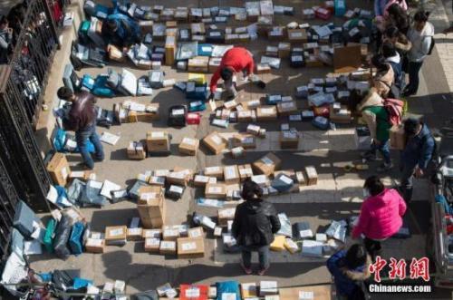 資料圖:快遞工作人員忙著分揀滿地的快遞。武俊杰攝