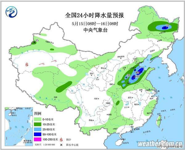 本周前半段降水重心集中在北方。中央氣象臺預(yù)計,5月15日08時至16日08時,黑龍江中部、遼寧東南部、河北東南部、山東西部和北部、山西東南部、河南北部等地的部分地區(qū)有大雨,其中河南東北部、山東西北部、河北東南部、黑龍江中部等地有暴雨,局地大暴雨,上述部分地區(qū)并伴有雷暴大風(fēng)、短時強(qiáng)降水等強(qiáng)對流天氣。為此,中央氣象臺5月15日06時發(fā)布暴雨藍(lán)色預(yù)警。