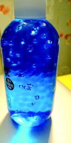 水彈槍的子彈則是直徑為1厘米左右的藍(lán)色透明小顆粒,需要泡水后使用。說明書中介紹,這種子彈是一種水化合物,含有聚丙烯酸鈉交聯(lián)共聚物。經(jīng)過兩小時水泡后,小顆粒變成直徑約2厘米的藍(lán)色顆粒,對人體“無毒無害”。