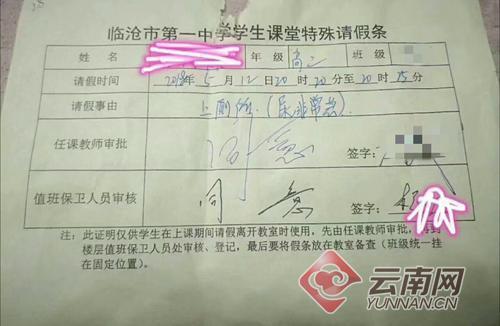 云南臨滄:學(xué)生上課去廁所要填請(qǐng)假條并簽兩次字 學(xué)?;貞?yīng):防止學(xué)生去廁所抽煙