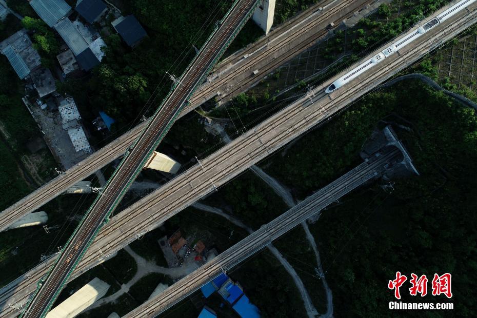 5月16日,航拍貴陽市郊交織的五條高鐵線路,一列動車駛出隧道。貴州省地處中國西南腹地,高原山地居多,因此高鐵建設的橋隧占比較高。在貴陽市烏當區(qū)新添寨,高鐵滬昆線、貴廣客運專線、貴開城際客運專線的隧道和橋梁交織在一起,形成“五洞五橋”并行。中新社記者賀俊怡攝