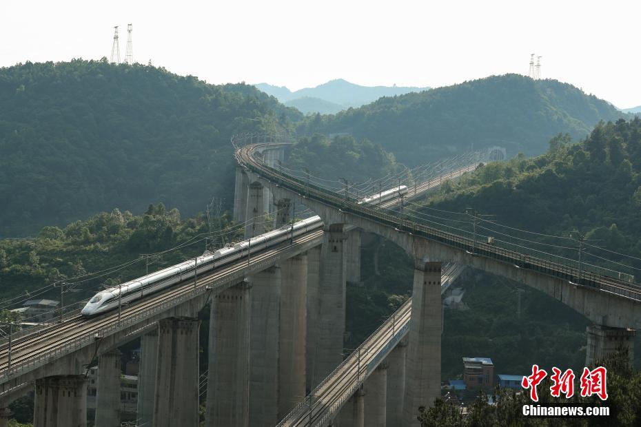 5月16日,一列動車從貴陽市郊交織的橋梁上駛過。貴州省地處中國西南腹地,高原山地居多,因此高鐵建設(shè)的橋隧占比較高。在貴陽市烏當(dāng)區(qū)新添寨,高鐵滬昆線、貴廣客運(yùn)專線、貴開城際客運(yùn)專線的隧道和橋梁交織在一起,形成“五洞五橋”并行。中新社記者賀俊怡攝
