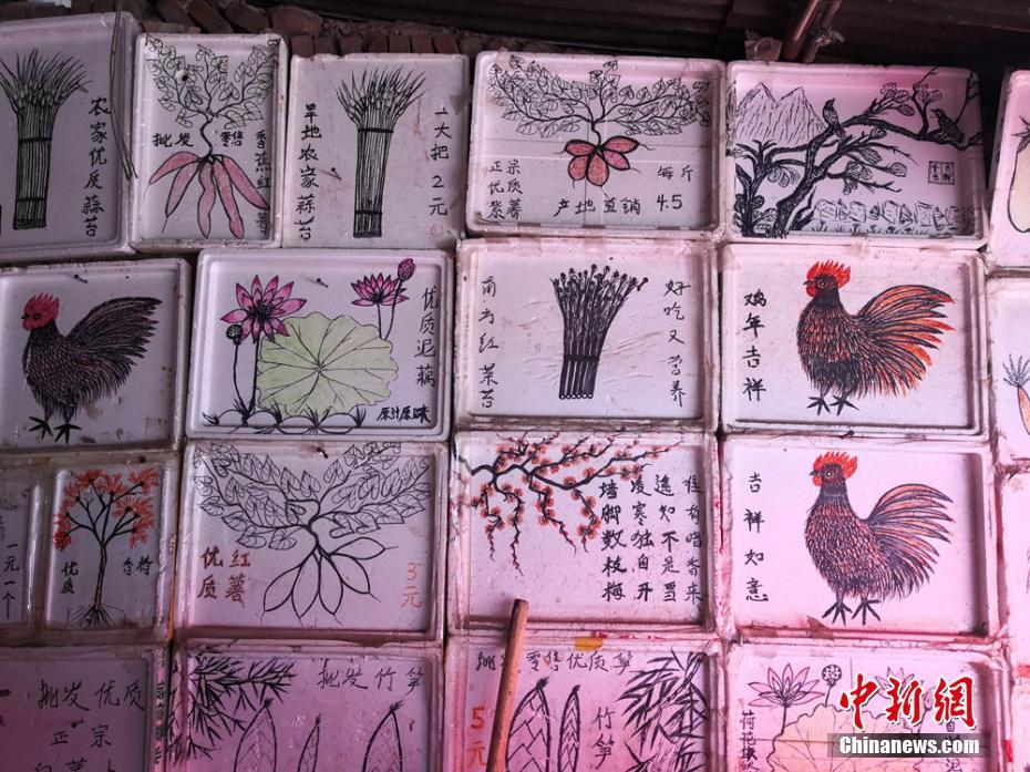 5月17日,蘭州西固區(qū)一家菜市場內(nèi),經(jīng)營了近二十年賣菜生意的胡二玲在一塊廢棄的塑料泡沫上繪畫。從小熱愛繪畫的她將自己店內(nèi)的蔬菜都畫在泡沫上,上面除了標(biāo)明價(jià)格還會(huì)寫上此種蔬菜的具體功效,為前來挑選的顧客提供便利。胡二玲稱,每天起早貪黑很辛苦,但是要學(xué)會(huì)苦中作樂,發(fā)現(xiàn)生活的美好。 楊娜 攝