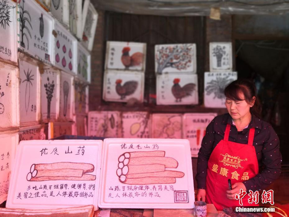 圖為胡二玲畫的山藥,并標(biāo)明了各自的功效。經(jīng)營了近二十年賣菜生意的胡二玲利用空閑時間手繪了一份蔬菜“菜單”。 楊娜 攝