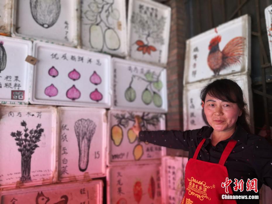 胡二玲將蔬菜畫在泡沫上,并標(biāo)明價格等,供顧客挑選。 楊娜 攝