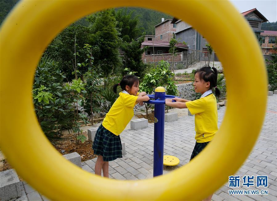 今年11歲的鐘小芳(左)與雙胞胎妹妹鐘小蘭在村里的健身器材旁玩耍。新華社記者胡晨歡攝圖片來源:新華網(wǎng)