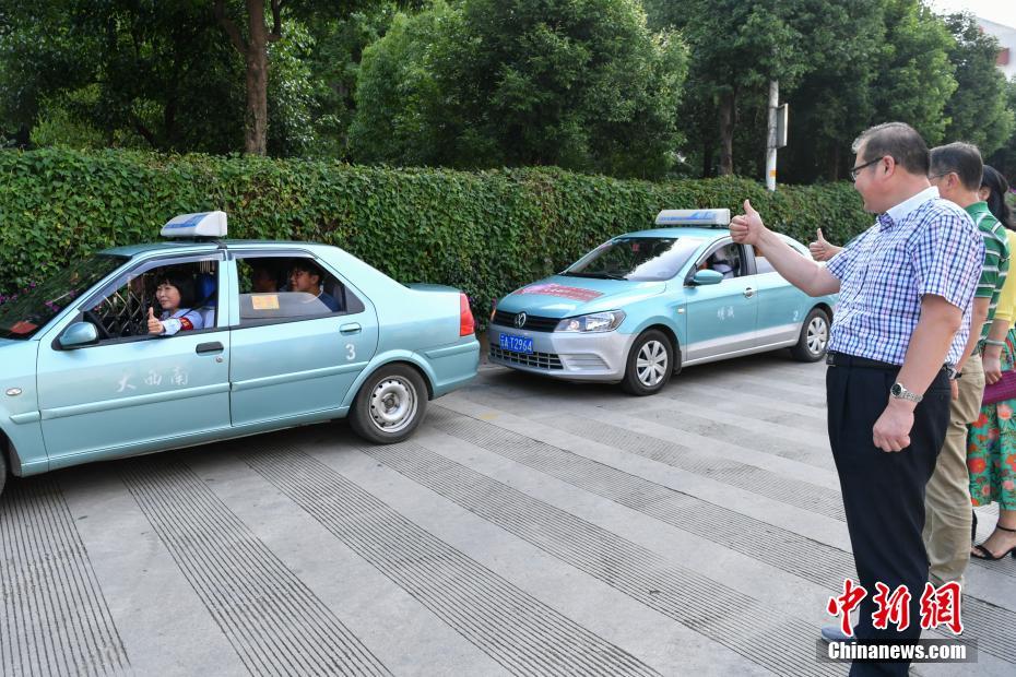 6月8日,學(xué)校老師為考生加油。當(dāng)日,昆明“雷鋒出租汽車(chē)隊(duì)”在昆明第一中學(xué)西山學(xué)校門(mén)前等待參加2018年高考的學(xué)生,他們將免費(fèi)把學(xué)生送到各自的考場(chǎng)。據(jù)了解,該車(chē)隊(duì)已經(jīng)堅(jiān)持“愛(ài)心送考”15年不間斷。中新社記者任東攝