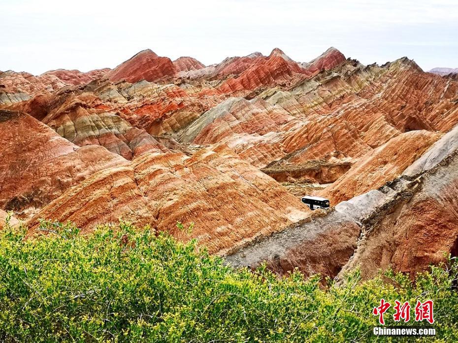夏日的甘肅張掖七彩丹霞在綠色植物點(diǎn)綴下,景觀更為迷人,七彩山巒似乎神筆勾畫,巧奪天工。絡(luò)繹不絕的游人,你拍我照互相留影,流連忘返,用鏡頭帶走七彩丹霞的壯美。吳學(xué)珍攝
