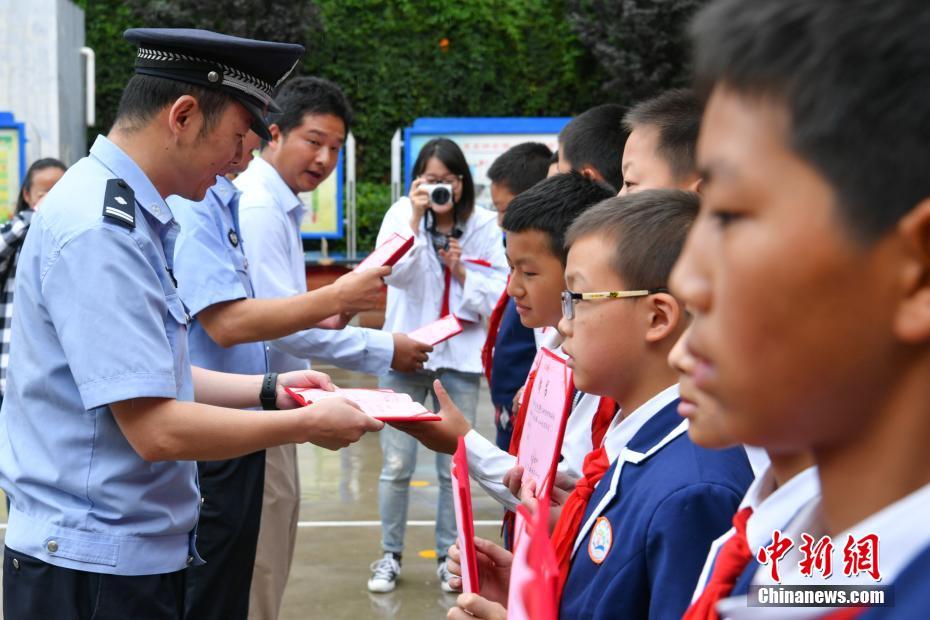 昆明警方向小學(xué)生頒發(fā)“反校園欺凌巡邏隊(duì)”聘書。中新社記者任東攝