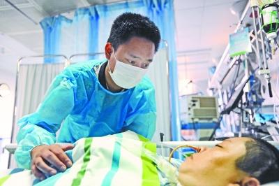 6月12日,中南醫(yī)院ICU病房,馮濤呼喚昏迷中的妻子記者苗劍攝