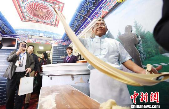 2018年4月26日,蘭州牛肉拉面等地方特色文化登上“環(huán)西部火車(chē)游”,旅客可以在旅途中欣賞牛肉拉面表演。(資料圖) 楊艷敏 攝