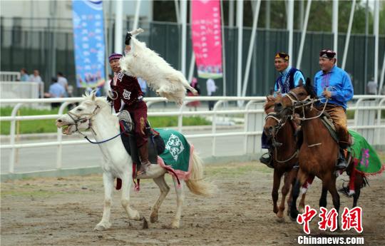圖為哈薩克族男子展示馬背上“叼羊”?!「吆晟茢z