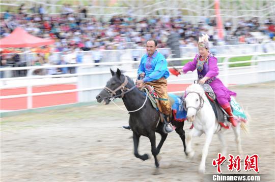 圖為哈薩克族民眾身穿民族服飾表演傳統(tǒng)體育競技“姑娘追”?!「吆晟啤z