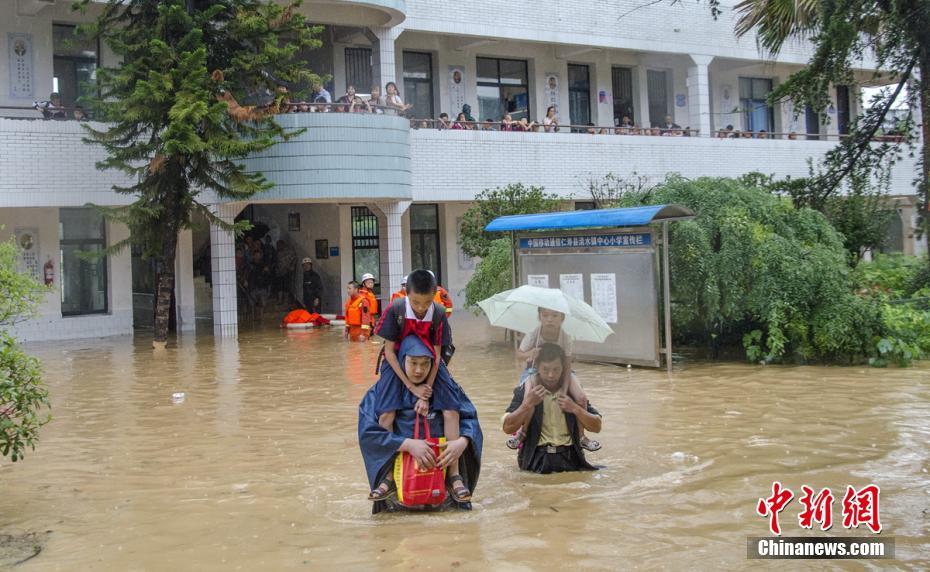 校園進水被淹,救援人營救轉移被困師生。梁衛(wèi)東攝