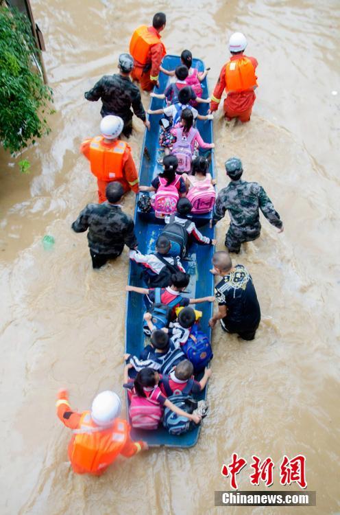 救援人員通過船只轉(zhuǎn)移被困學(xué)生。梁衛(wèi)東攝