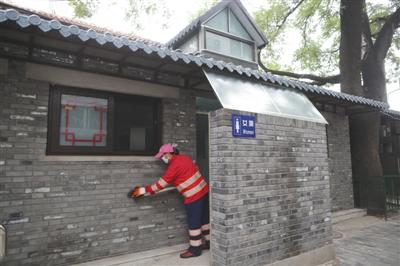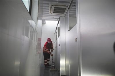 昨日,西城區(qū)龍爪槐胡同,環(huán)衛(wèi)工人在打掃衛(wèi)生間。