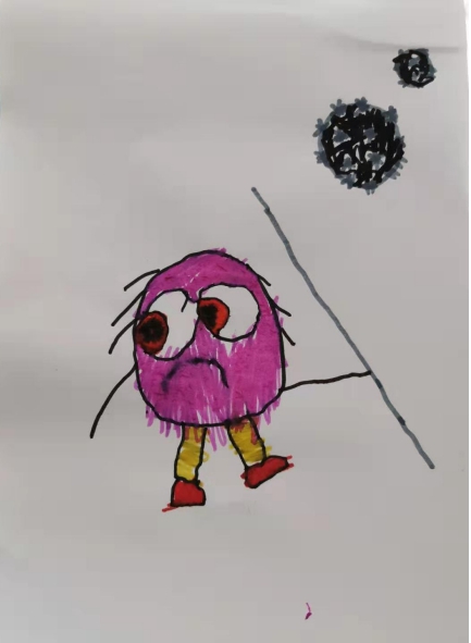 每天晚上工作完回到住的地方,愛人就會和我視頻,讓我看看孩子,說孩子很想爸爸,總是問她爸爸去哪了?她就告訴孩子說爸爸去打病毒去了,孩子就說那我也要幫爸爸打病毒。有一天我回去,孩子視頻告訴我她畫了一幅畫,就是下面的這幅畫,她說她拿著棍子要把病毒打走,這樣爸爸就能早點(diǎn)回家了。我聽后眼淚在眼睛里打轉(zhuǎn),我告訴孩子爸爸一定會努力戰(zhàn)勝病毒,早日回家!
