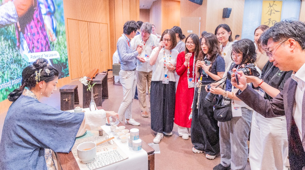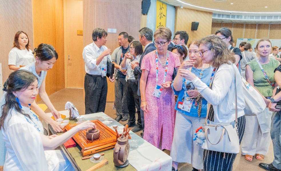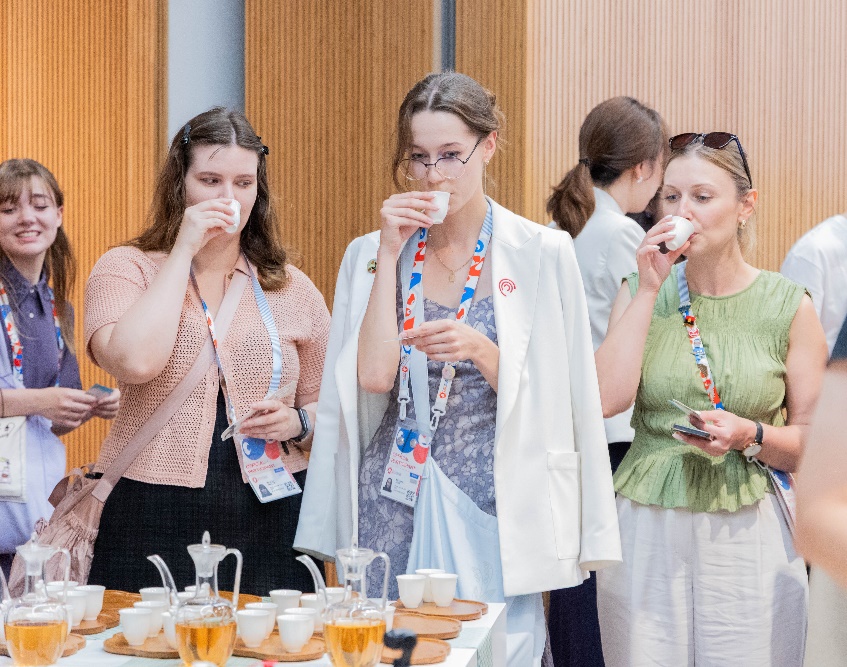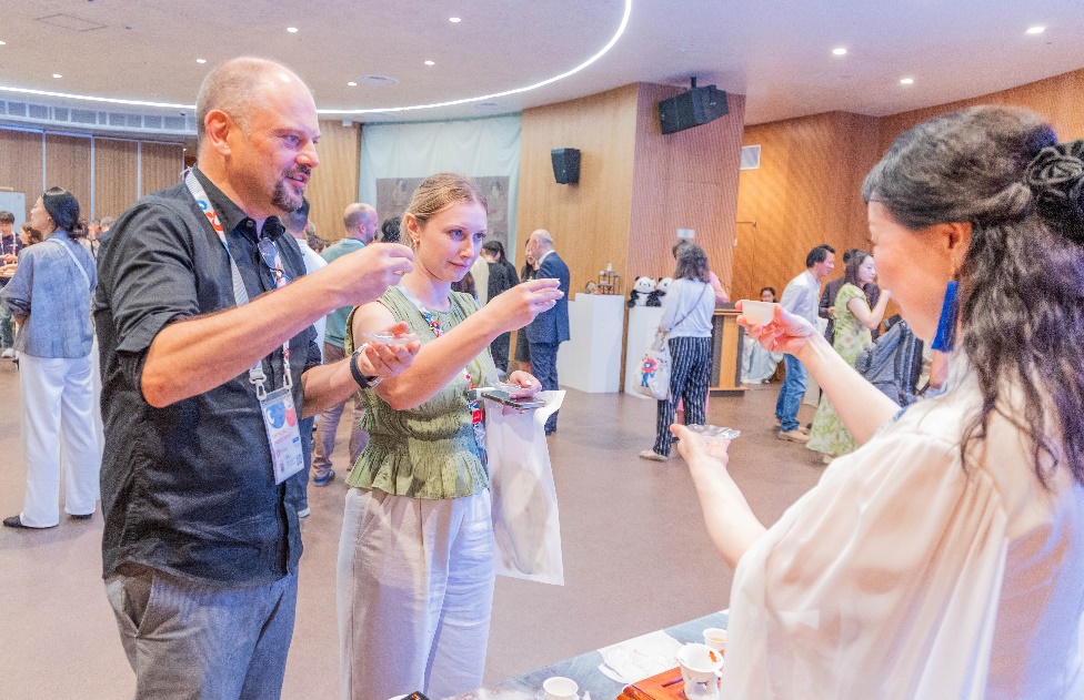 來自各國(guó)的嘉賓們?cè)谳p松愜意的氛圍中,以英語(yǔ)、日語(yǔ)或各自的母語(yǔ)品茗交談,或探討茶藝文化,或分享本國(guó)茶飲傳統(tǒng)。雖言語(yǔ)未必相通,但茶香無聲傳情。茶香與笑語(yǔ)交織,盡顯東方飲食文化的精致與溫情,現(xiàn)場(chǎng)氣氛溫馨熱烈。