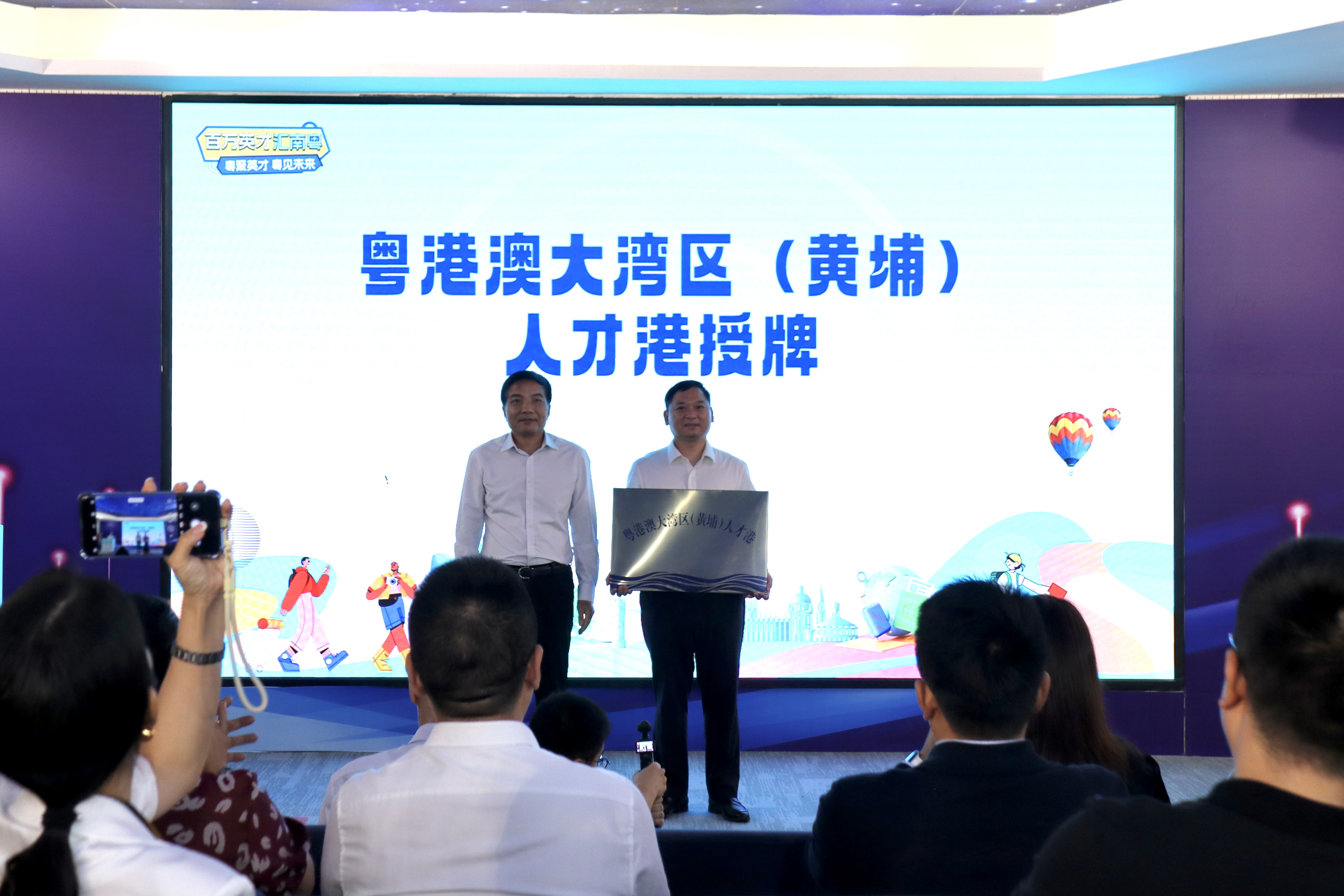 廣東省人才服務(wù)局局長周高生為中新廣州知識城國際人才自由港授予“粵港澳大灣區(qū)(黃埔)人才港”牌匾。