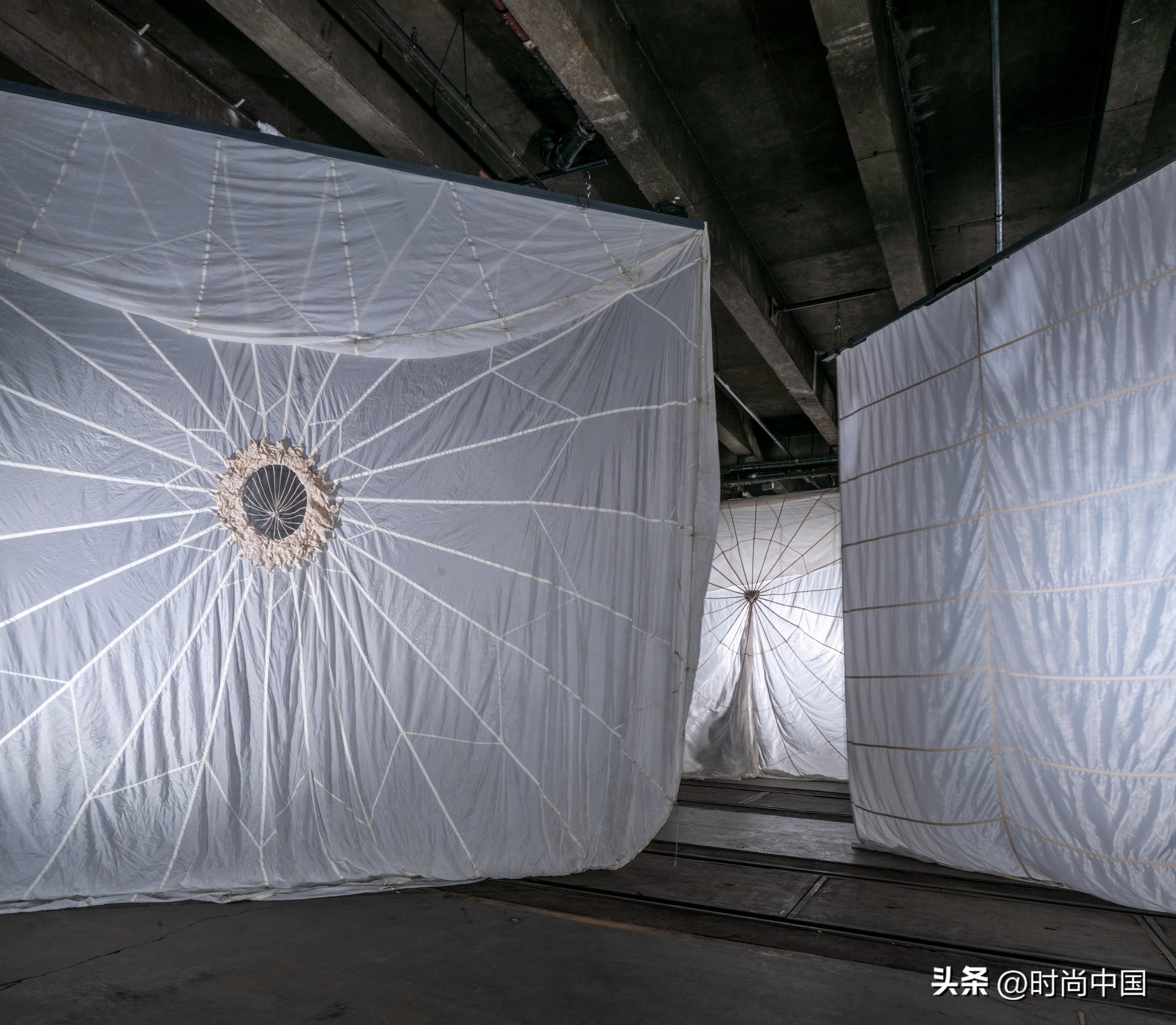帶有皮革捆繩的酸性黃羊毛草垛,背景為垂墜降落傘。