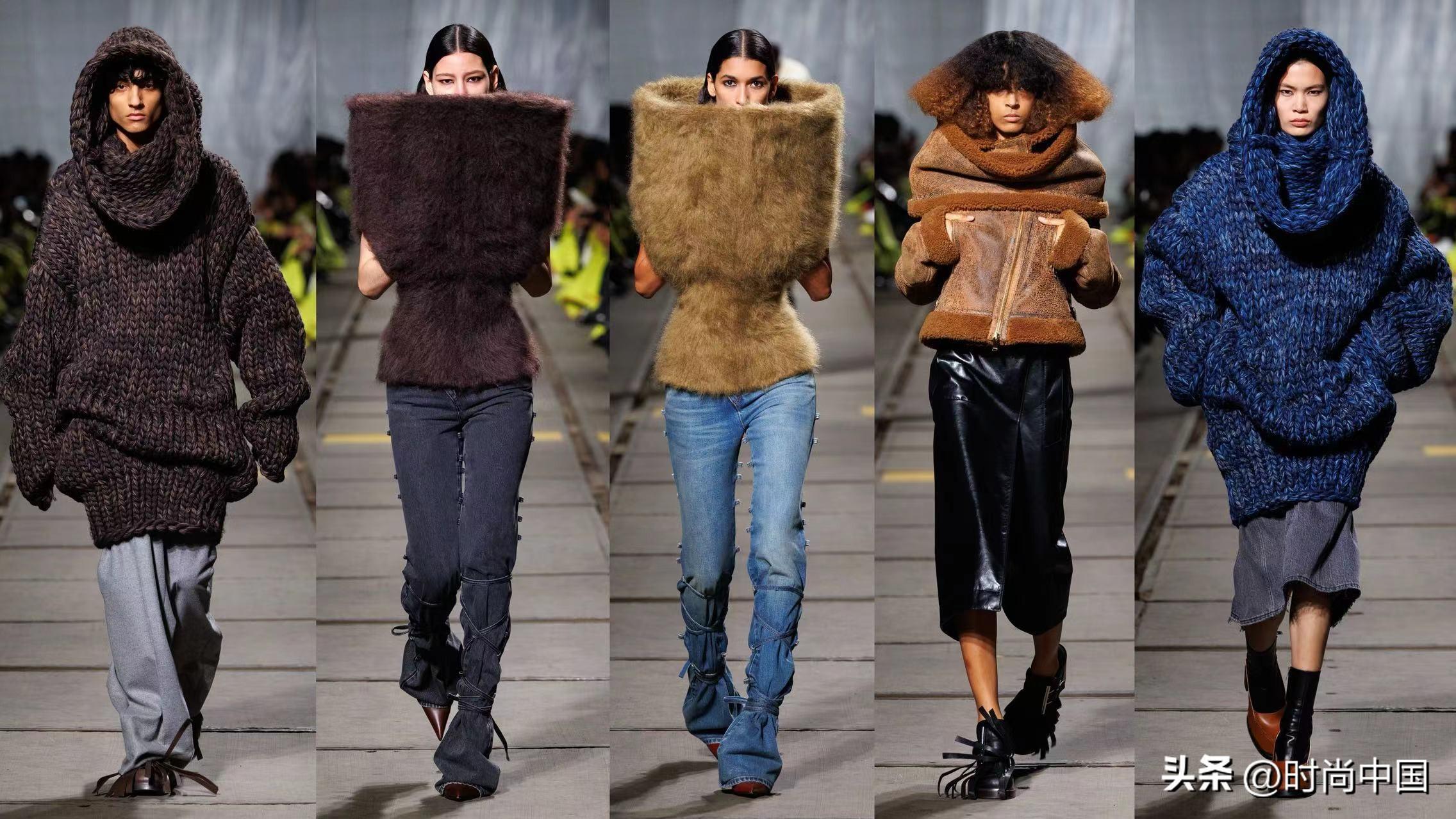 駝色上衣,上半部分為拉絨馬海毛罩衣,下半部分為雙面馬海毛針織束身衣,藍(lán)色石洗捆綁細(xì)節(jié)牛仔褲;