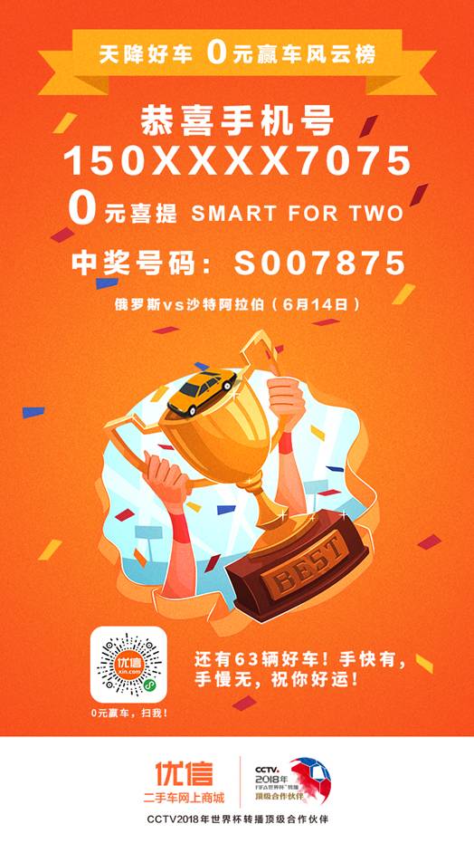 作為央視世界杯轉(zhuǎn)播頂級(jí)合作伙伴,優(yōu)信二手車在世界杯期間,推出了“當(dāng)燃現(xiàn)在 0元贏車”的驚喜福利互動(dòng),世界杯開幕當(dāng)天,首場(chǎng)比賽競(jìng)猜就吸引了數(shù)萬人參與。其中有兩萬九千多人猜中俄羅斯勝,最終手機(jī)尾號(hào)7075的幸運(yùn)兒捧走了第一臺(tái)奔馳Smart大獎(jiǎng)。優(yōu)信超大福利瞬間點(diǎn)燃全民參與熱情!