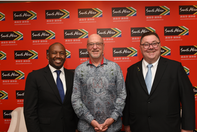 從左至右:南非旅游局首席執(zhí)行官Sisa Ntshona先生、南非國(guó)家旅游部部長(zhǎng)Derek Hanekom先生、南非旅游局亞太區(qū)總裁白文博先生,在現(xiàn)場(chǎng)接受媒體采訪。