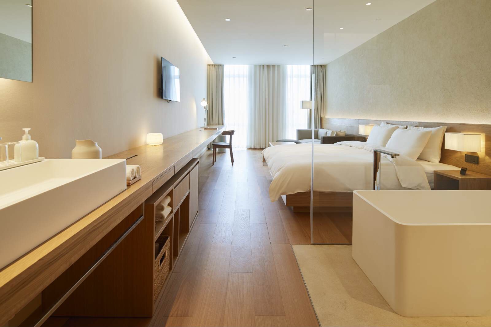 據(jù)悉,MUJI HOTEL BEIJING共擁有6種房型、共計42間客房,包括面積最小18平米的標(biāo)準(zhǔn)間、最大75平米的套房等多種房型。客房內(nèi)部采用硅藻土、麻、棉、石等傳統(tǒng)沿用的自然素材,為整個空間打造天然質(zhì)感。素材、家具與燈具等細(xì)節(jié)裝飾充分考慮對睡眠的影響,省去了繁瑣的裝飾和多余的功能??头績?nèi)的部分家具及裝飾可在位于地下一層的無印良品北京坊店內(nèi)購買。