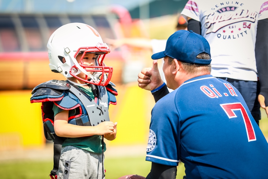 UPRO兒童美式體育教育場(chǎng)地上小朋友與教練互動(dòng)