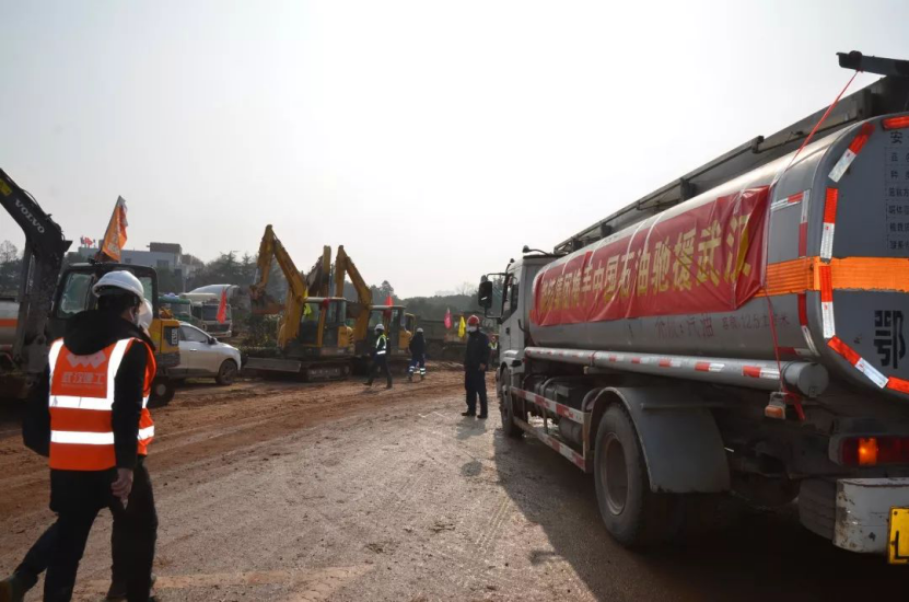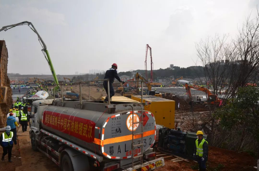 1月28日上午十點,兩輛載滿16噸油品的中國石油油罐車,駛入蔡甸在建的火神山醫(yī)院工地現(xiàn)場,為緊張施工的各類車輛、發(fā)電機、及工程器械快速加注油品,保障施工過程緊湊高效持續(xù)。