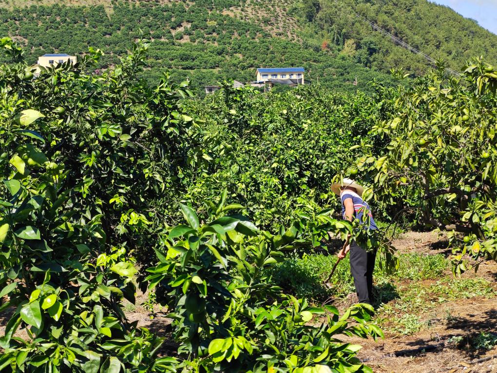 村民在大壩村的橙林中工作(2025年8月13日攝)。新華社記者蔣聲雄攝