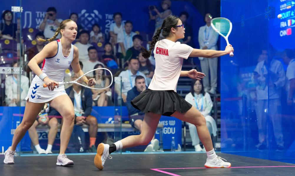 8月10日,劉子儀(右)在比賽中回球。當(dāng)日,在2025年成都世運(yùn)會(huì)壁球女子單打遺材賽四分之一決賽中,中國(guó)選手劉子儀不敵法國(guó)選手萊婭·巴爾博。新華社記者 李旭倫 攝