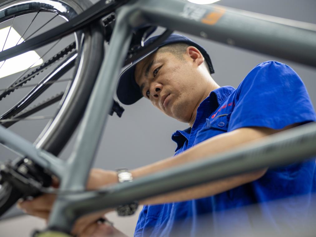 7月16日,在吉林化纖集團復(fù)材體育休閑裝備產(chǎn)業(yè)園,工人組裝碳纖維自行車車架。新華社記者 邵澤東 攝