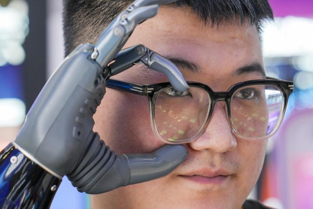 2025年7月17日,在北京舉行的第三屆中國國際供應鏈促進博覽會上,浙江強腦科技有限公司一名右手殘疾的工作人員在佩戴了BrainCo智能仿生手后摘取眼鏡。新華社記者鞠煥宗攝
