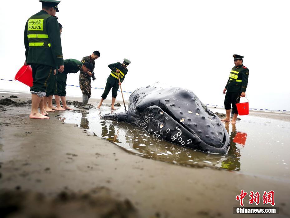 3噸重座頭鯨擱淺啟東海灘 營救5小時(shí)脫困