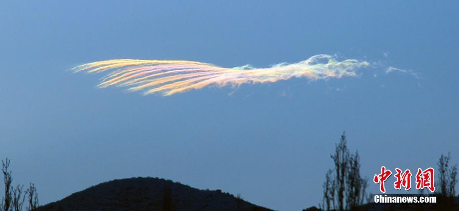 天山天池上空祥云經(jīng)過(guò)一個(gè)小時(shí),變成了五彩羽翼。甄梅攝