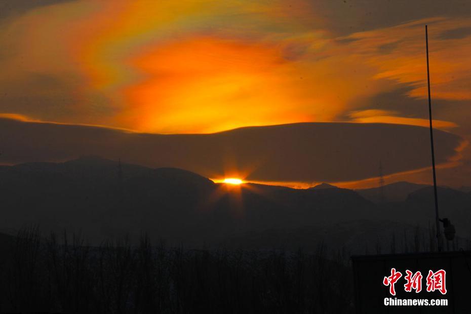 新疆天池出現(xiàn)五彩云霞 如羽翼般絢麗多彩