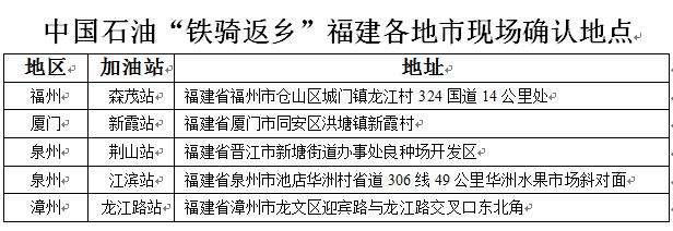 完成信息登記后,2月3-4日,鐵騎要到福建福州、廈門、泉州、漳州的指定加油站,領(lǐng)取“中國(guó)石油‘溫暖回家路?鐵騎返鄉(xiāng)’”專用憑證。憑這個(gè)證,可以在2月6日-3月16日,前后40天時(shí)間里,在沿途指定中國(guó)石油加油站進(jìn)行免費(fèi)加油等。