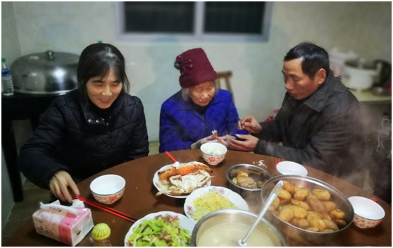 老鐘回到家中,家里早已做好一桌他愛吃的菜。他的兒媳趕緊去廚房把菜又熱了一遍,為歸人斟滿米酒,洗去路途中的風(fēng)塵。