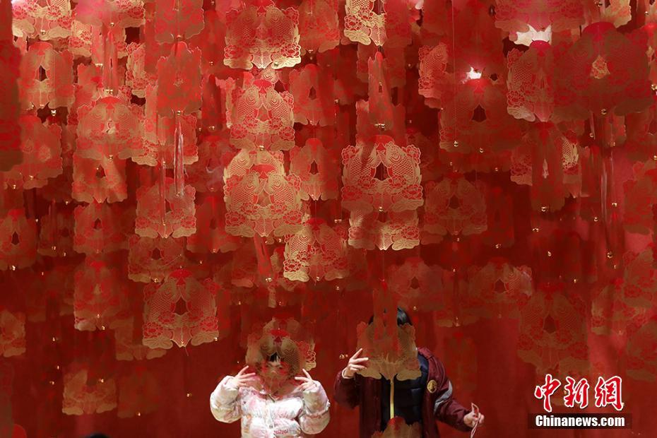 在新世紀新年展區(qū),屋頂懸掛“年年有余”吉祥裝置。泱波攝