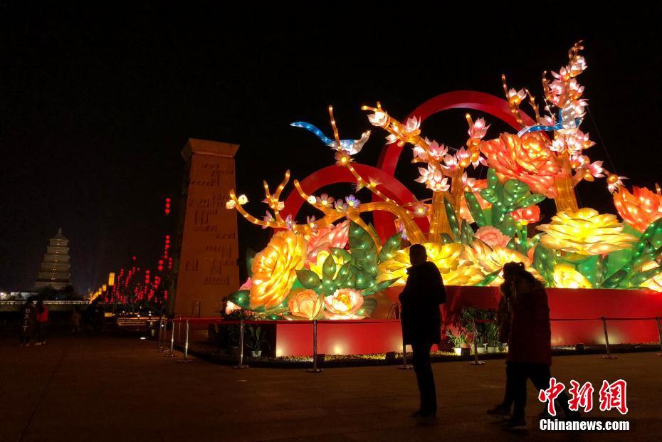 2月11日晚間,西安市2018年大唐芙蓉園新春燈會(huì)的彩燈和遠(yuǎn)處的大雁塔競(jìng)相輝映,絢麗多姿。中新社記者侯宇攝